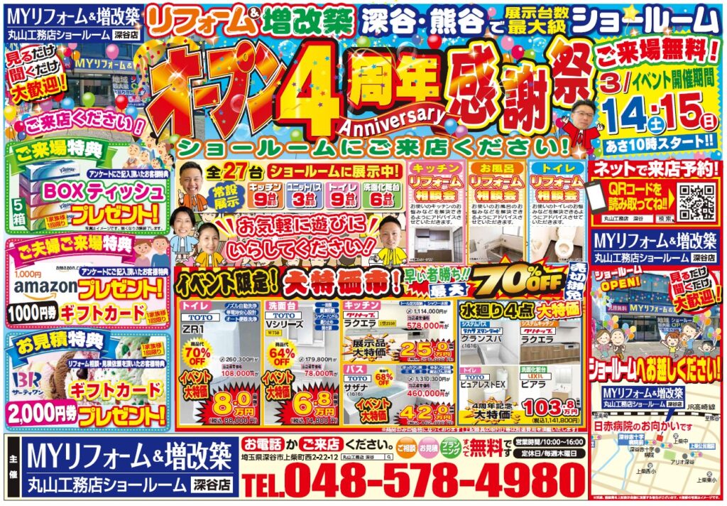2026年3月14(土)・15(日)は丸山工務店深谷ショールームへ!おかげさまでオープンから4周年を迎えられました!感謝の気持ちを込めて、2日間限定大特価市!最大70%OF… -