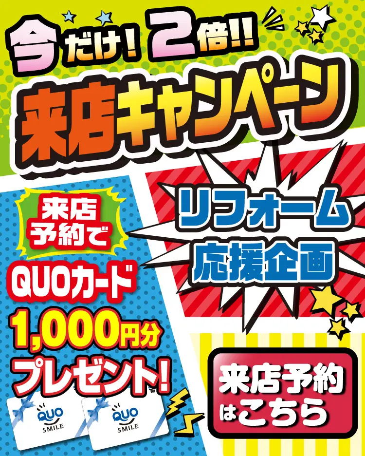【秩父・深谷ショールーム】3/18~4/30の期間中に、ホームページから来店予約でQUOカード1000円分プレゼント!いつもの2倍で超お得♪ ご予約は「来店予約フォーム」からお願いします。この機会をどうぞお見逃しなく! いつもありがとうございます。埼玉県秩父市・深谷市のリフォーム・増改築・リノベーションは丸山工務店へお任せください!