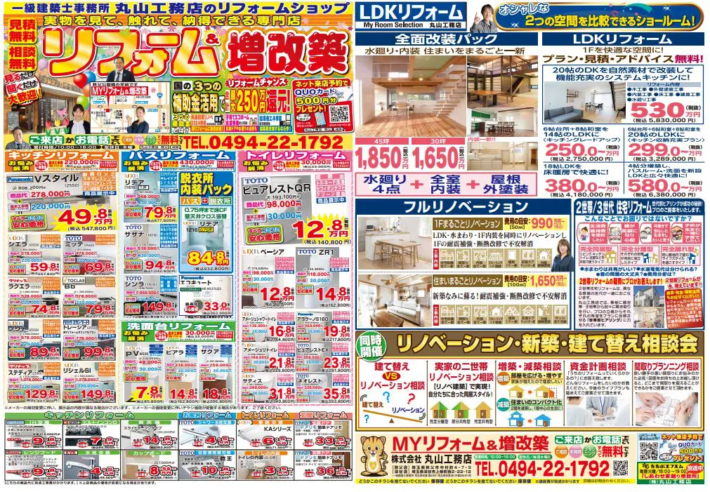 【秩父・深谷ショールーム】 お風呂・キッチン・洗面化粧台・トイレをまとめてリフォームするとお得! 期間中に、このページから来店予約→ご成約の方にカタログギフト2万円分プレゼント♪ お得なキャンペーンをお見逃しなく! いつもありがとうございます。埼玉県深谷市・熊谷市・秩父市・寄居町のリフォーム・増改築・リノベーションは丸山工務店へお任せください!