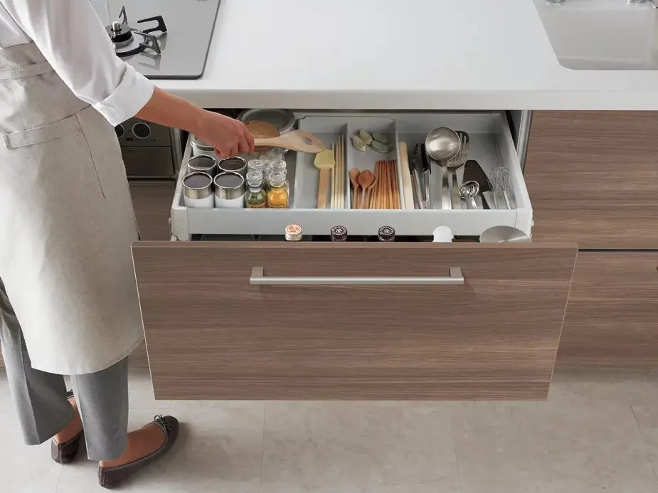 使いやすくシンプルな設計で、10mm単位ですき間を調整できるフィットサイズ対応。リフォームにも適したキッチンです。