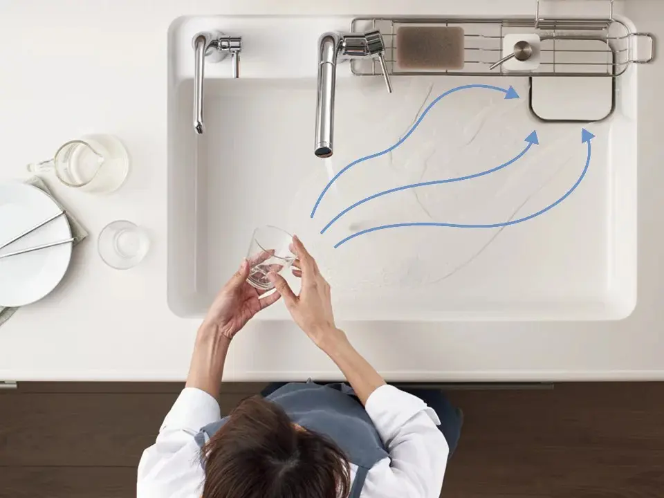 シンク・網カゴ・排水口の3つのすべり台で、水やゴミをすべるように流し、シンク内をキレイに保つことができます。