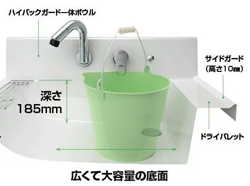 広くて作業しやすい底面。ハイバックガード一体ボウル&壁付き水栓なので水ハネを拭きとりやすく水栓まわりに汚れがたまりにくくお手入れ簡単です。