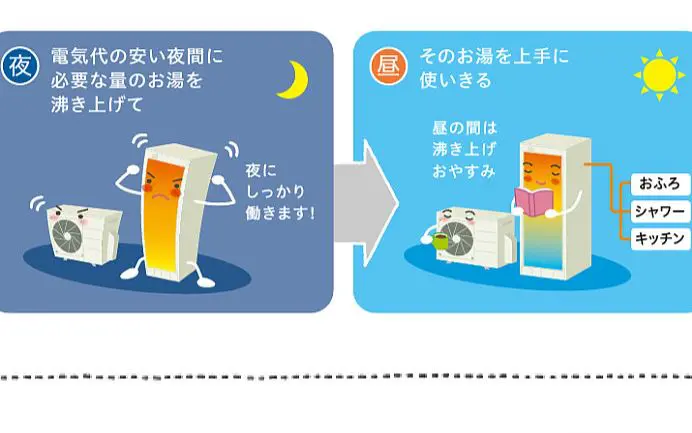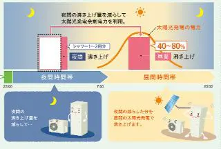 天気予報データと太陽光発電状況により、日中に余剰電力を利用して沸き上げ。スマホに専用のアプリを入れ自動設定できる。または給湯器のリモコンから手動設定も可能。