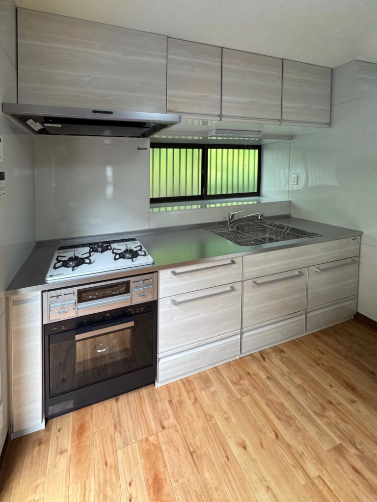 【秩父郡/キッチンリフォーム】ガスオーブンもセットされた高機能キッチンへリフォーム。木目が美しいフローリングはまるで無垢材のよう!#タカラスタンダード#トレーシア#TOYOTEX#キュビスム